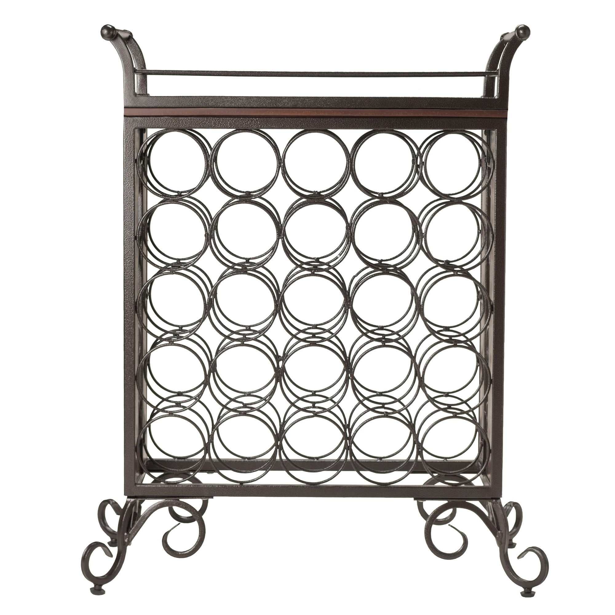 Silvano 5x5 Wine Rack brings class and elagance to your wine storage holding 25 bottles in individual crafted slots with a removable tray made for serving. Its constructed from metal in dark bronze finish and wood for the tray and comes with adjustable feet for uneven floors. The removable tray is 23.1"W x 10.3"D x 5"H with a serving surface of 19.25"W x 6.9"D. Each wine holder slot has a diameter of 3.5". The overall assembled size of the wine rack is 25.8"W x 13.5"D x 30.1"H. Made with combination of composite wood plus veneer; metal frame and wrought iron. Assembly required.Overall wine rack size is 25.8"W x 13.5"D x 30.1"H.Removable tray with handle size is 23.1"W x 10.3"D x 5"D. Tray serving surface is 19.25"W X 7"\D.Made with composite wood plus veneer; metal frame and wrought iron. Assembly required.nullnullnull This product meets the oversized requirement per UPS/FedEx. The shipping weight reflected is the dimensional weight. This product also meets the large package requirement per UPS/FedEx. The estimated shipping cost will include this fee. Large package is $70.00; applied when length plus girth [(2 x width) + (2 x height)] combined exceeds 130 inches. Additional Handling charge of $10.50 applied where a package's longest side exceeds 48 inches in length; the second longest side exceeds 30 inches in length; or total weight is greater than 70 lbs.This product meets the oversized requirement per UPS/FedEx. The shipping weight reflected is the dimensional weight. This product also meets the large package requirement per UPS/FedEx. The estimated shipping cost will include this fee. Large package is $70.00; applied when length plus girth [(2 x width) + (2 x height)] combined exceeds 130 inches. Additional Handling charge of $10.50 applied where a package's longest side exceeds 48 inches in length; the second longest side exceeds 30 inches in length; or total weight is greater than 70 lbs.