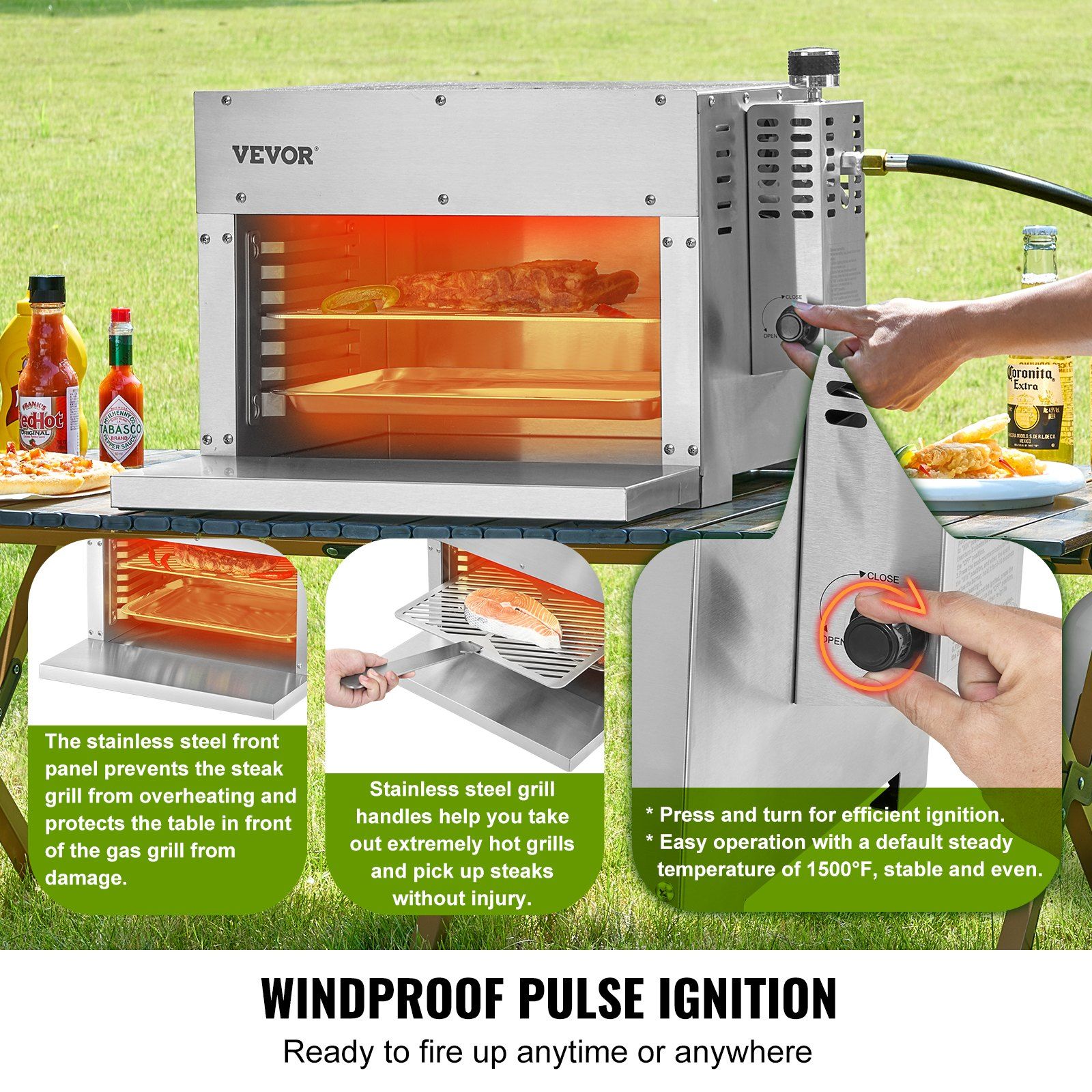 The gas steak grill preheats to 1500°F in just 5 minutes, faster than a conventional oven, making it simple to achieve chef-quality sear.