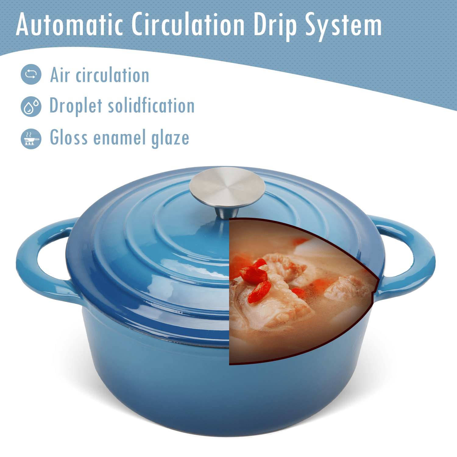 2.Porcelain Enamel Coating: The 5 QT cast iron dutch oven features smooth porcelain enamel coating,provides a great heat conductor. And it proven to effectively distribute & retain heat for an even & consistent temperature throughout the entire pot. Excellent for slow cooking soups, stews & chili