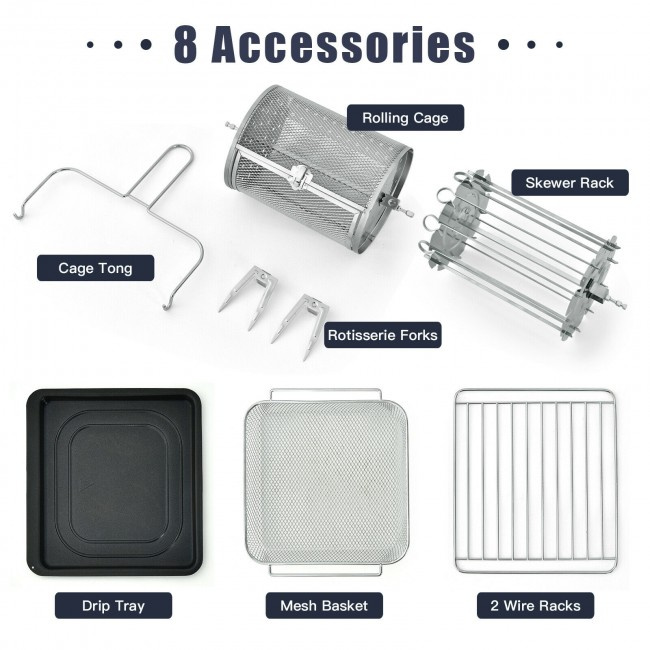 Package includes: 1 x Air fryer toaster oven1 x Rotisserie fork1 x Cage tong1 x Skewer rack1 x Rolling cage1 x Drip tray1 x Mesh basket2 x Wire racks1 x Instruction