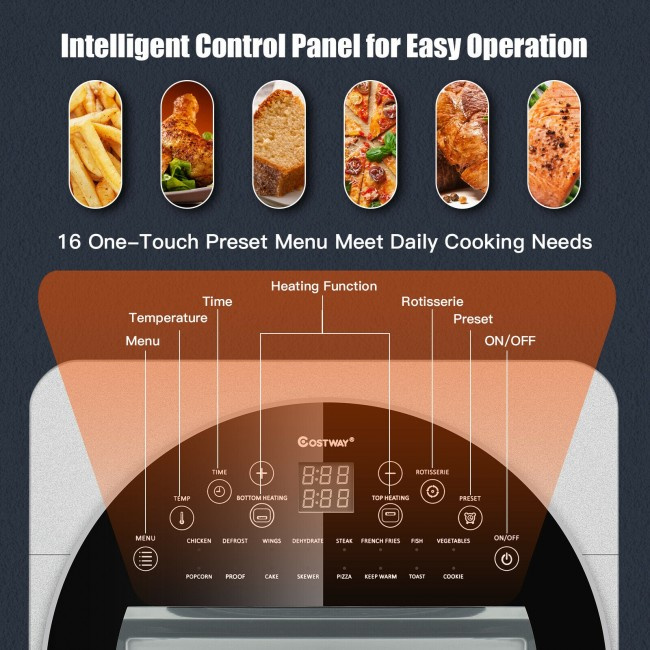 1.16-in-1 Versatile Air Fryer Oven: Featuring with 16 pre-set cooking menus: Cake/ Chicken/ Fish/ Pizza/ Steak/ Toast/ Proof/ Wings/ Cookie/ Defrost/ Skewer/ Popcorn/ Vegetables/ French Fries/ Keep Warm/ Dehydrate.
