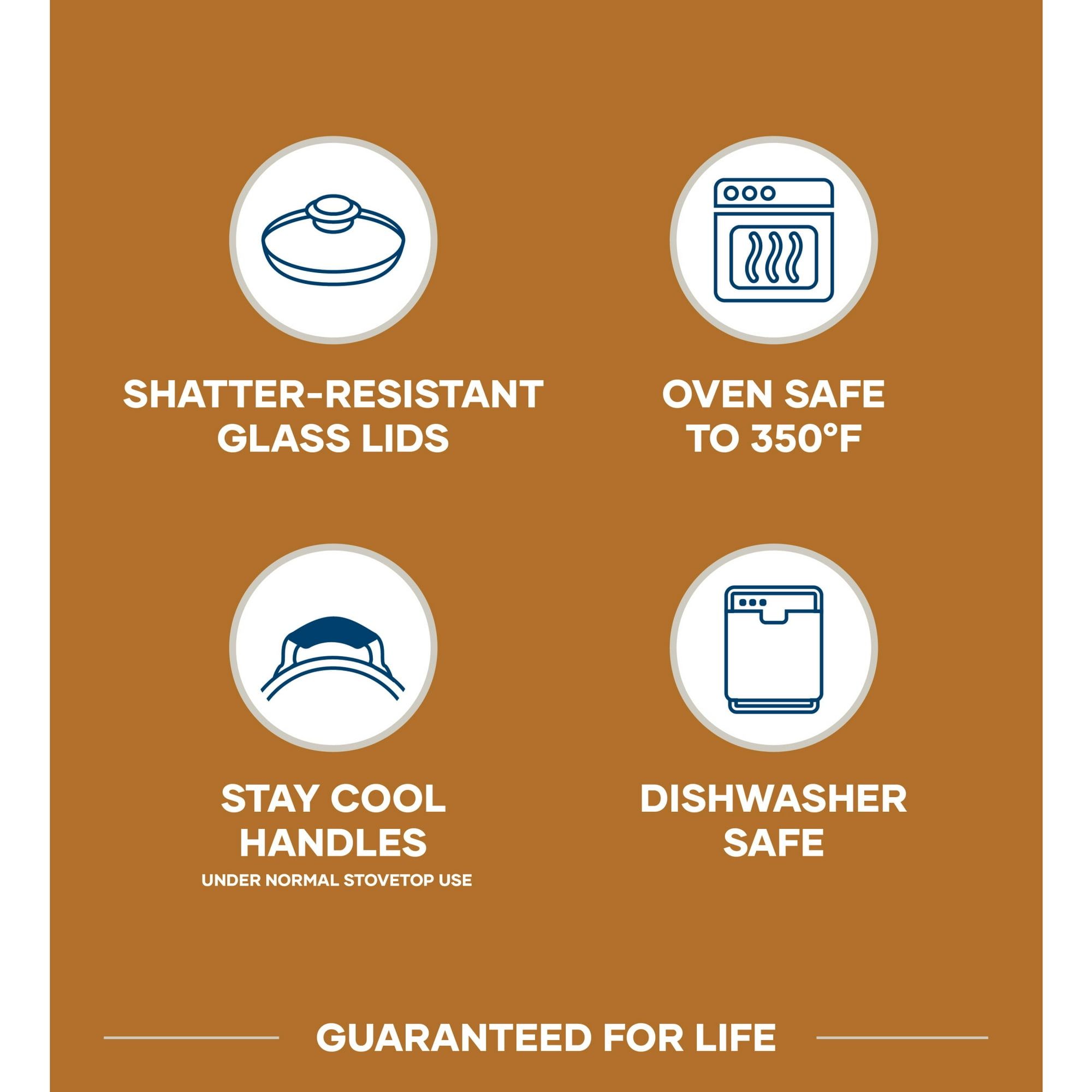 4.Cookware is oven safe to 350°F for cooking versatility (cooking utensils are not intended for oven use)